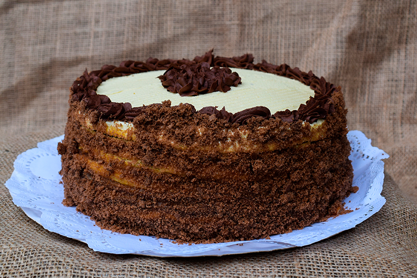 Chocolatoso bizcocho de chocolate con nueces relleno de mousse de chocolate.
